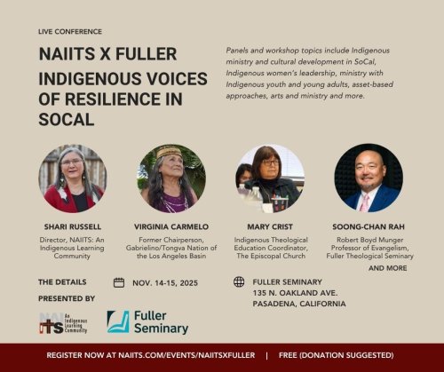 NAIITS x Fuller: Indigenous Voices of Resilience in SoCal — a partnership between NAIITS: An Indigenous Learning Community and Fuller Seminary — runs Nov. 14 to 15, 2025, in the Travis Auditorium at Fuller Seminary in Pasadena, California.