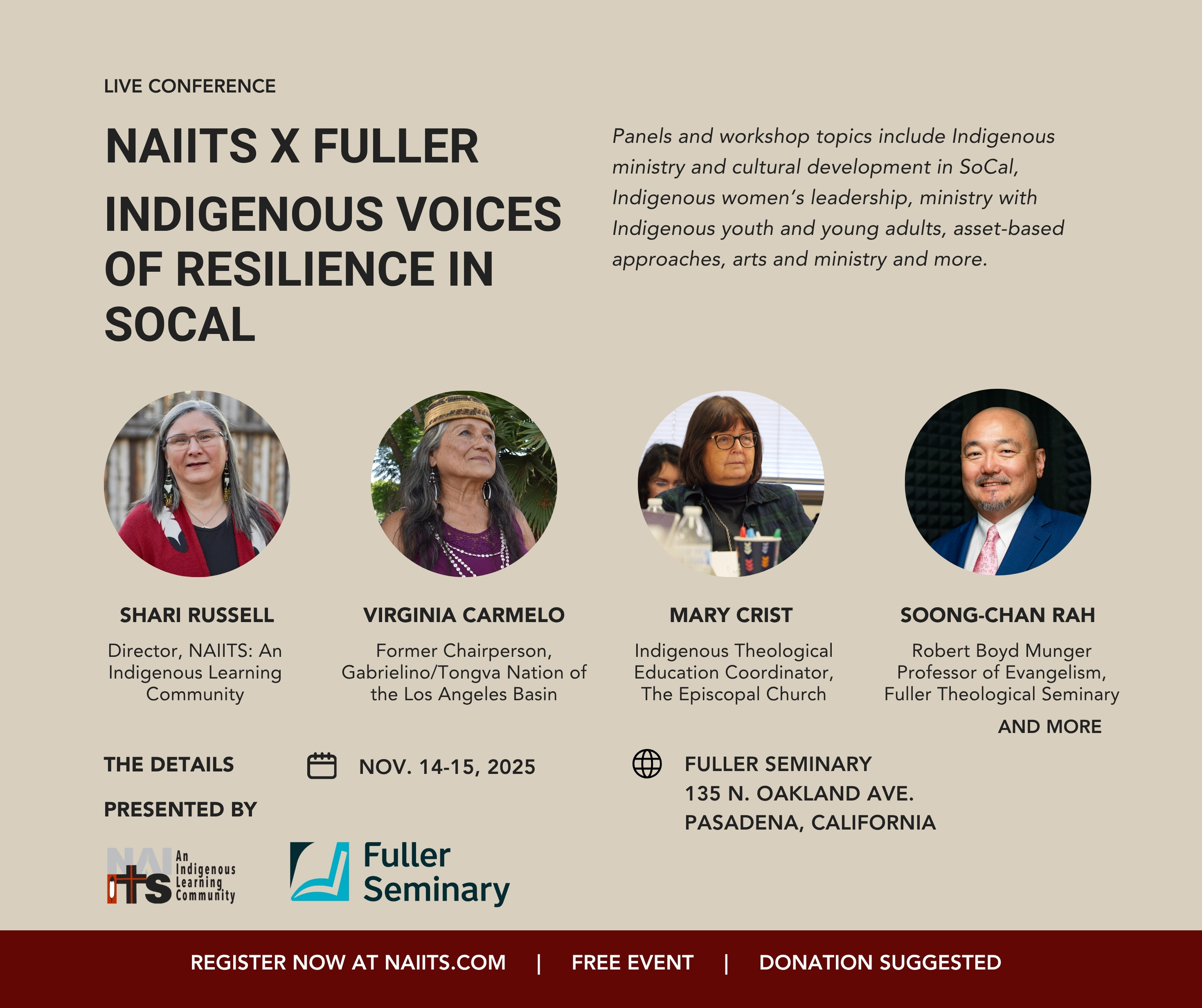 Speakers include Shari Russell, director of NAIITS: An Indigenous Learning Community; Virginia Carmelo, former chairperson of the Gabrielino/Tongva Nation of the Los Angeles Basin; Mary Crist, Indigenous theological education coordinator for The Episcopal Church; Soong-Chan Rah, Robert Boyd Munger Professor of Evangelism at Fuller Theological Seminary and co-author of “Unsettling Truths: The Ongoing, Dehumanizing Legacy of the Doctrine of Discovery;” and more.